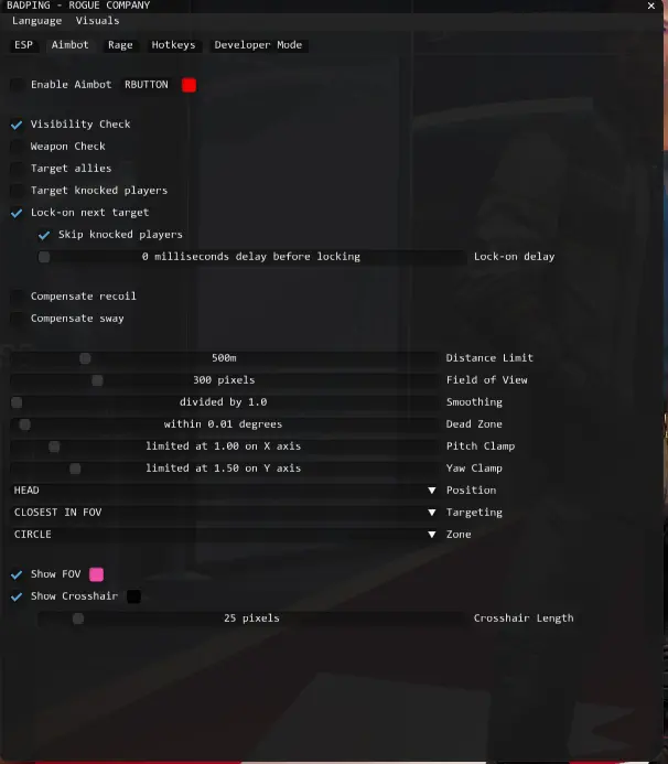 Configure your Rogue Company cheat with precision. Tune visual overlays and aim assistance (FOV, smoothing, target areas), set input preferences, and adjust on-screen information, all optimized for stability and performance.